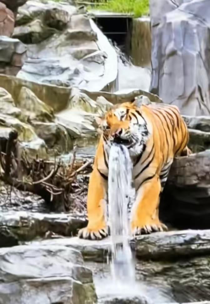 据网友发布视频显示,一只老虎口吐泉水一动不动,不少游客以为这是雕塑,过了一会儿老虎动了一下后,人们才发觉这是真老虎咬住了水管。不少网友评论“水虎传——虎口瀑布”“这才是正儿八经的虎口瀑布!”。